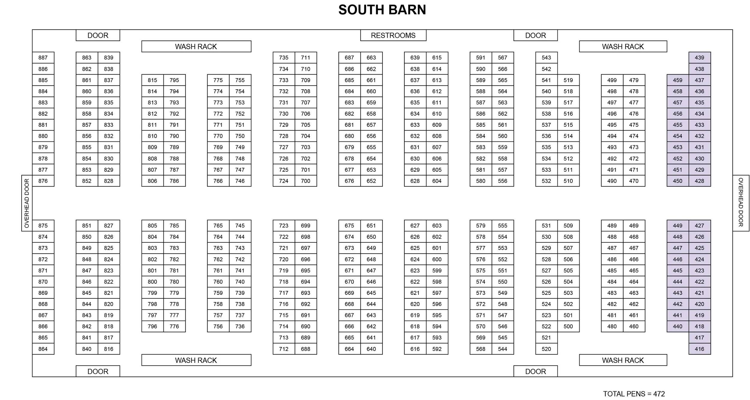 Exhibitors are penned with their school, and each school’s penning is figured at 2 pigs per pen. These stalls are 5x5.